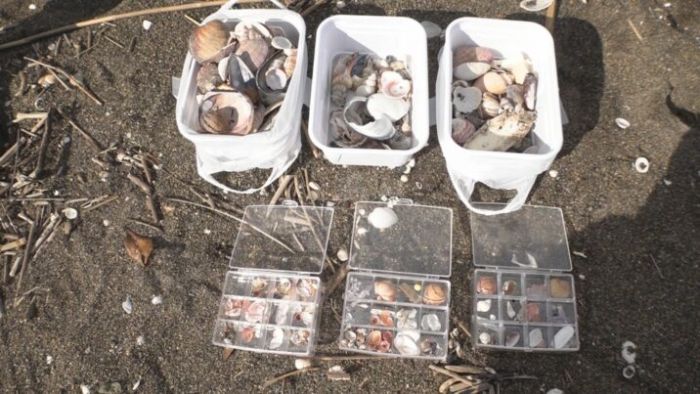 拾い始めて1時間半、形も色も様々の貝が容器いっぱいに集まりました。