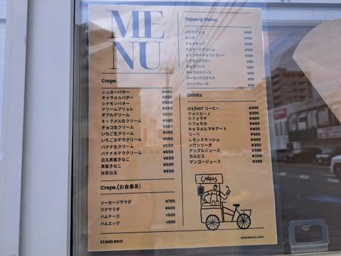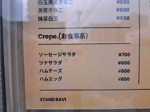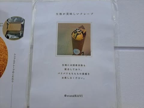 stand RAVIはモチモチ生地が自慢のクレープ屋さん。 甘いデザート系からお食事系まであります。 実はここだけの話、雨の日だけの特典もあるんです。 雨の日はチョコチップ・キャラメルソース・チョコソースのいずれかトッピング無料とお得! 現在オープンして1ヶ月ちょっと。 新作メニューも今後作っていきたいということで、これからも楽しみなお店です!