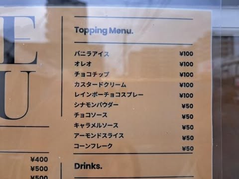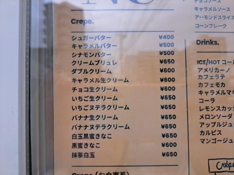 価格は400円~650円。 シンプルなシュガーバター、果物を使ったいちごやバナナ生クリーム、和の白玉黒蜜きなこなど、どれも美味しそうです! こちらのクレープには追加でトッピング(50~100円)もつけることができます。