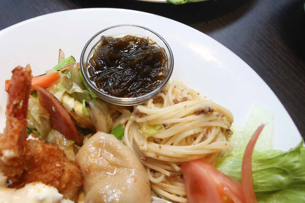 中央の小鉢は冷や奴です。 ネギやミョウガなどの薬味が、口のなかをさっぱりさせます。 ちなみに、同行した連れの方のプレートは小鉢ではなく「てびち」でしたが、あっさりした味わいでおいしい!と感想をいただきましたよ。