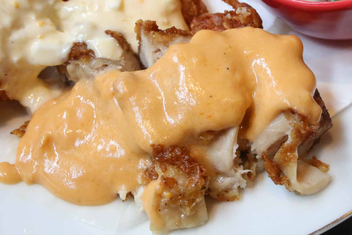 チキンはとてもジューシー! ソースはチキンを焼いて出てきた脂に、牛乳とケチャップを加えて作っているそうです。