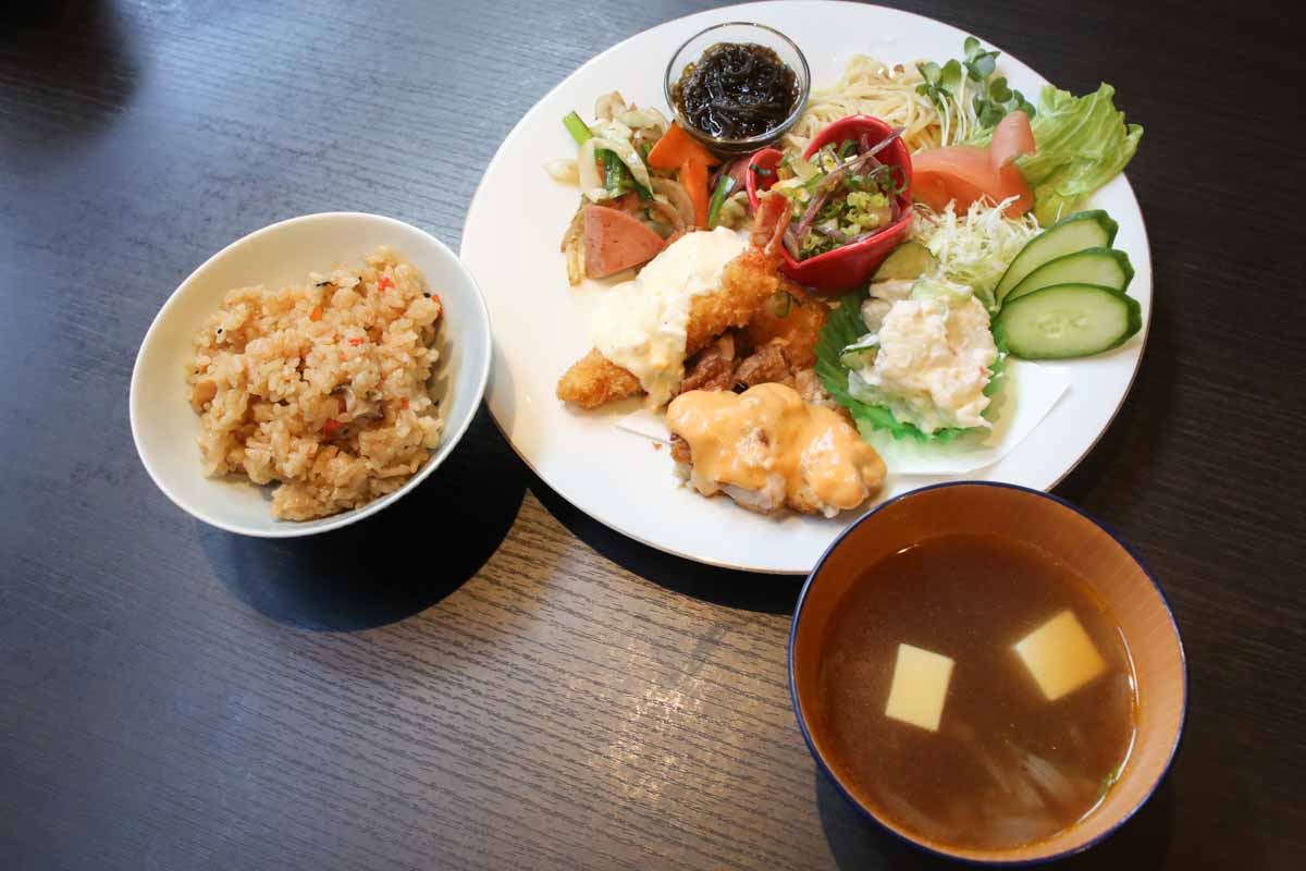 白米の代わりに、ごはんは「釜めし」です。 釜めしも日替わりで提供しているとのことで、この日の釜めしはダシが香る濃いめの味つけでした。 ちなみに、金曜日のごはんはカレーなんだとか。 ボリューム満点のプレートに、さらにカレーがつくなんて贅沢すぎます!