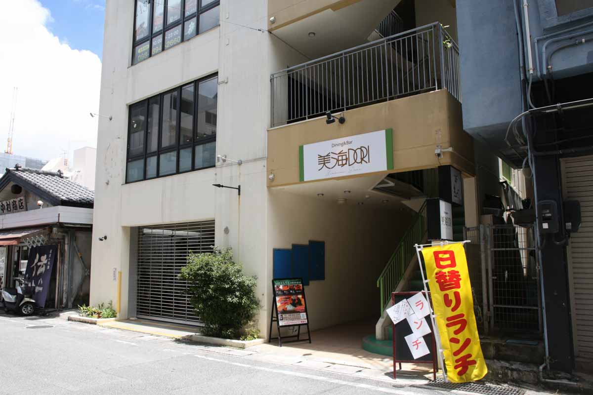 那覇市の中心部に位置しながらも都会の喧騒を忘れさせてくれる「Dining&Bar 美海DORI(以下、美海DORI)」。ゆいレール県庁前駅から徒歩数分と好立地ながら、ビルの2階にひっそりと佇むそのロケーションは、まさに「隠れ家」と呼ぶにふさわしいお店です。 お店の入るビルは、那覇の街並みに溶け込むような現代的なデザインです。美海DORIの入り口はビルの2階にあり、一見すると見過ごしてしまいそうですが、それがかえって特別感を演出しています。 看板やエントランスは洗練された雰囲気で、これからはじまる美食体験への期待感を高めてくれます。外からは店内の様子がうかがい知れないため、扉を開ける瞬間にワクワク感を感じるでしょう。