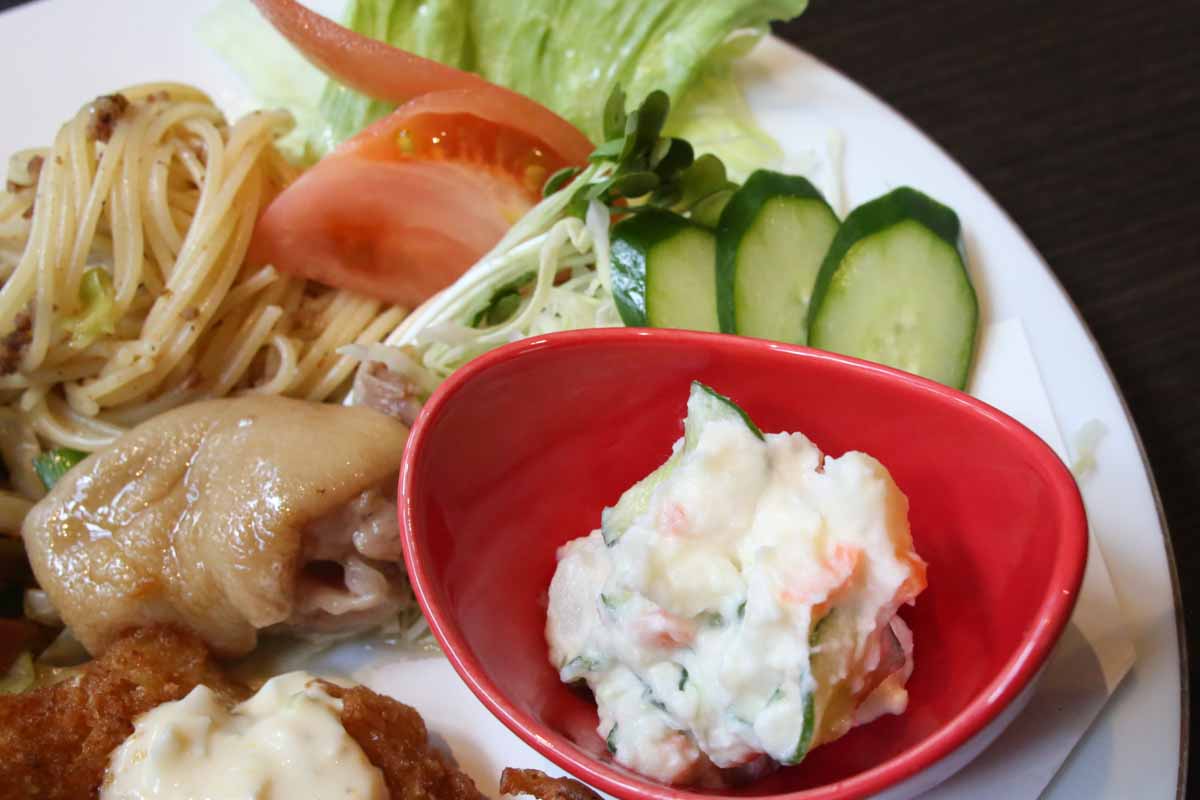 シェフいわく「ランチにはサラダをつけるようにしている」とのこと。 この日はポテトサラダとグリーンサラダがついていました。 シンプルな昔ながらのポテトサラダで、適度に芋感が残っており食べごたえがあります。 グリーンサラダに使うドレッシングは「ごま」や「フレンチ」など、バランスを考えて決めているそうです。