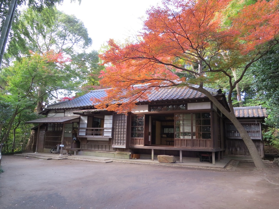大正から昭和初期に建てられた別荘で、現在は市の指定文化財。庭には多くの樹木が植えられ、燃えるようなモミジが秋を彩る。当時の面影が残る建物と紅葉による景観は絵になり、いつもと違う趣の紅葉を満喫できる。
