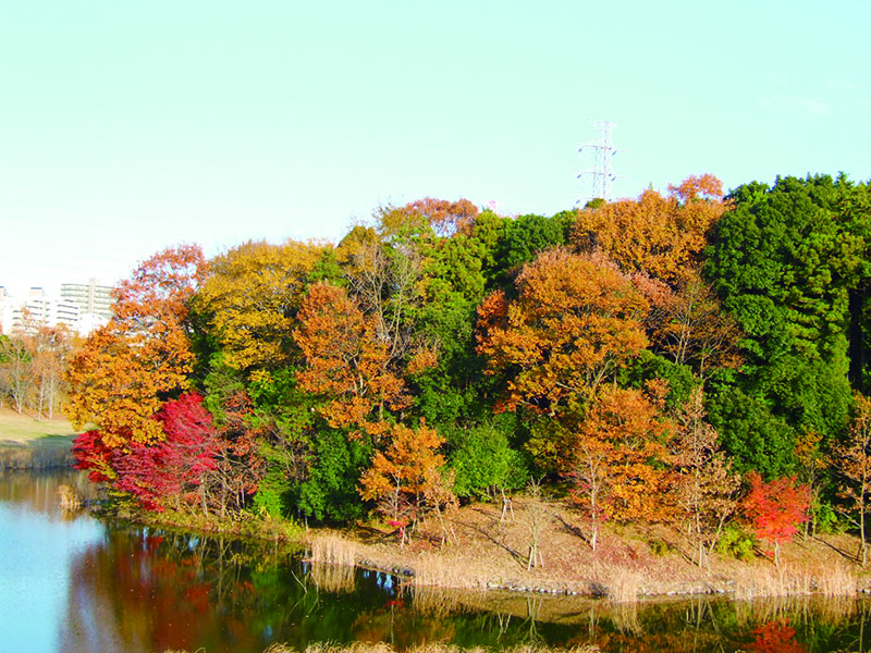 豊かな自然と水辺の景観が魅力の公園は市民の憩いの場。池の周囲に植えられたモミジやカエデ、ケヤキが鮮やかに色づき、水面に映り込む景色は格別。また、自然環境ゾーンのモミジのトンネルも見逃せない!