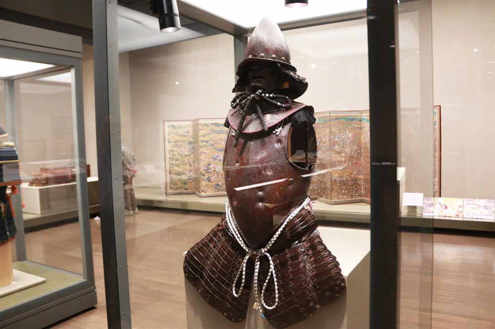 展示室に入り、目を引くのが、細かな文様が美しい「南蛮道具足」。徳川家康が所用したイタリア製の甲ちゅうで、同館学芸員の佐藤顕さんは「胴部分のくぼみは火縄銃の跡。丈夫であるという証として、事前に試し撃ちをしたことが分かります」と説明します。