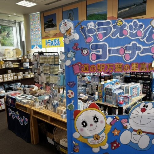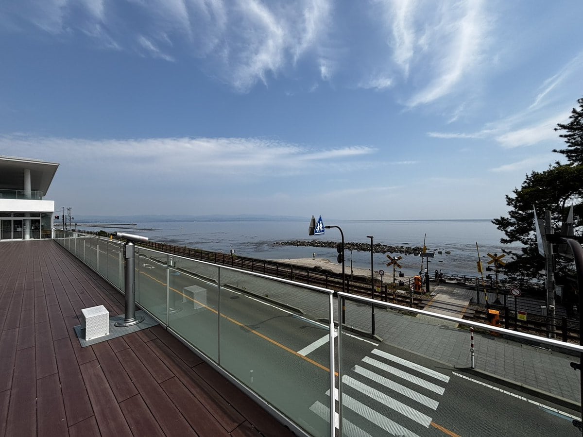 お土産コーナーには高岡銅器、漆器、地元銘菓、地酒、ドラえもんグッズが充実。カフェ「ISOMI TERRACE」では絶景を眺めながらバーガーやソフトクリームが楽しめます。展望デッキからは、氷見線の列車が風景を横切る瞬間も見られ、“写真映え” するシーンが盛りだくさん!