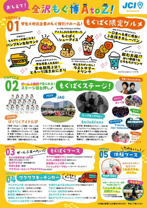 また特設ステージでは、「ほくりくアイドル部」やバンド「JAG」、ヒップホップクルー「8mileAliens」のライブに加え、よさこいやダンス、ジャズなど、見逃せないコンテンツが目白押し!MCには、「ぶんぶんボウル」も登場します!