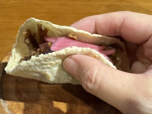角煮をほぐしたお肉がもりっと乗っているタコス。ピンクのものは玉ねぎです。