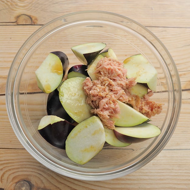 ② 一度取り出し、全体をかき混ぜてから再度ラップをかけ、600Wの電子レンジで2分加熱する。なすが柔らかくなり、火が通ったら、完成!