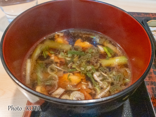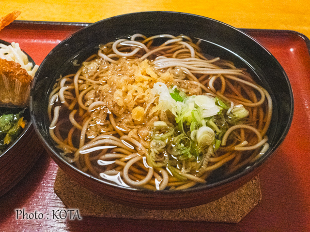 上、そばは温冷を選べるというので、温かいものを希望。いわゆる「たぬきそば」ですな。天かすほどほど、見た目よりあっさりと食べられる、うん、このそばは、ごはんとおかずに対し、汁物的な位置づけか。