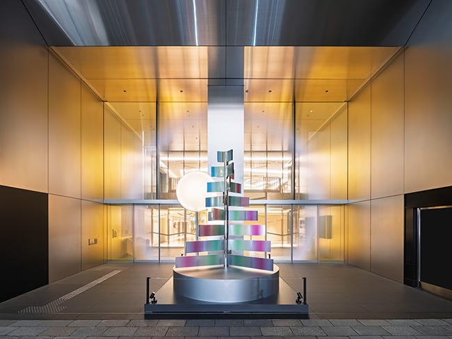 1階のエントランスでは、「YAR」がディレクションを手がけた独創的なインスタレーションと、「Nujabes」の名曲にインスピレーションを受けたグラフィックを楽しむことができる。音色を奏でるようにゆっくりと廻るオブジェ、人々を迎え入れるような虹色の光…、洗練された作品と音色を堪能してみて。