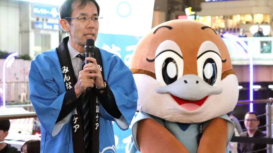 大阪府広報担当副知事もずやんが「魚庭の海おおさか大会」を法被を着てPR
