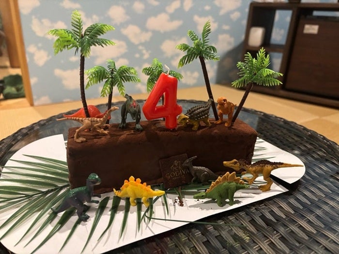 最後に「これに家から持ってきたミニ恐竜たちを乗せて…SHEINで買った飾りの葉っぱとヤシの木をさして…完成~」とケーキをデコレーションしたことを写真とともに報告。「我ながら良い感じ」と満足げにつづり、ブログを締めくくった。