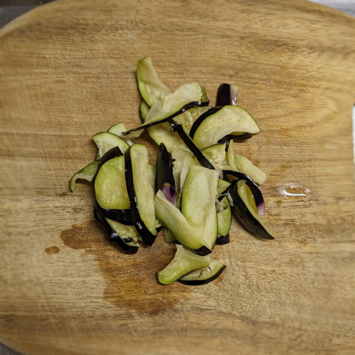 ナスは縦半分に切カットしてから、斜め薄切りにしましょう。