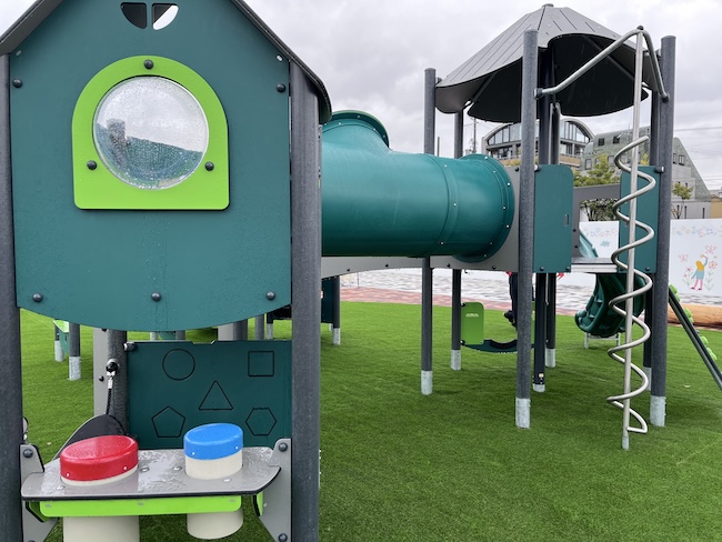 押すと楽しいボタンや回転する装飾、よじ登れる棒、くぐって渡る筒状の橋、2人並んで降りられる滑り台など、仕掛けは様々。楽しみながらいつのまにかさまざまな動きを体験できるのも、子どもの体の成長にプラスになりそうですね◎