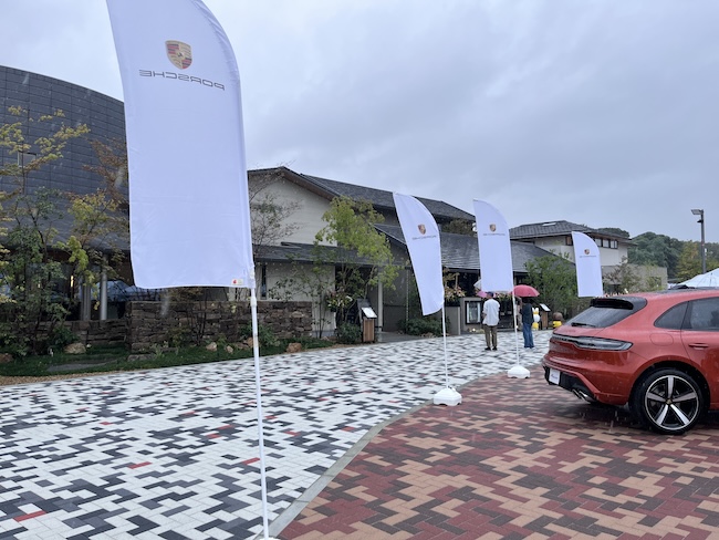 敷地に入ってすぐ右手には、多彩な催しをできるイベントスペースが広がります。オープニングイベントが行われたこの日は、展示品としてポルシェの高級車が何台も並んで圧巻でした。