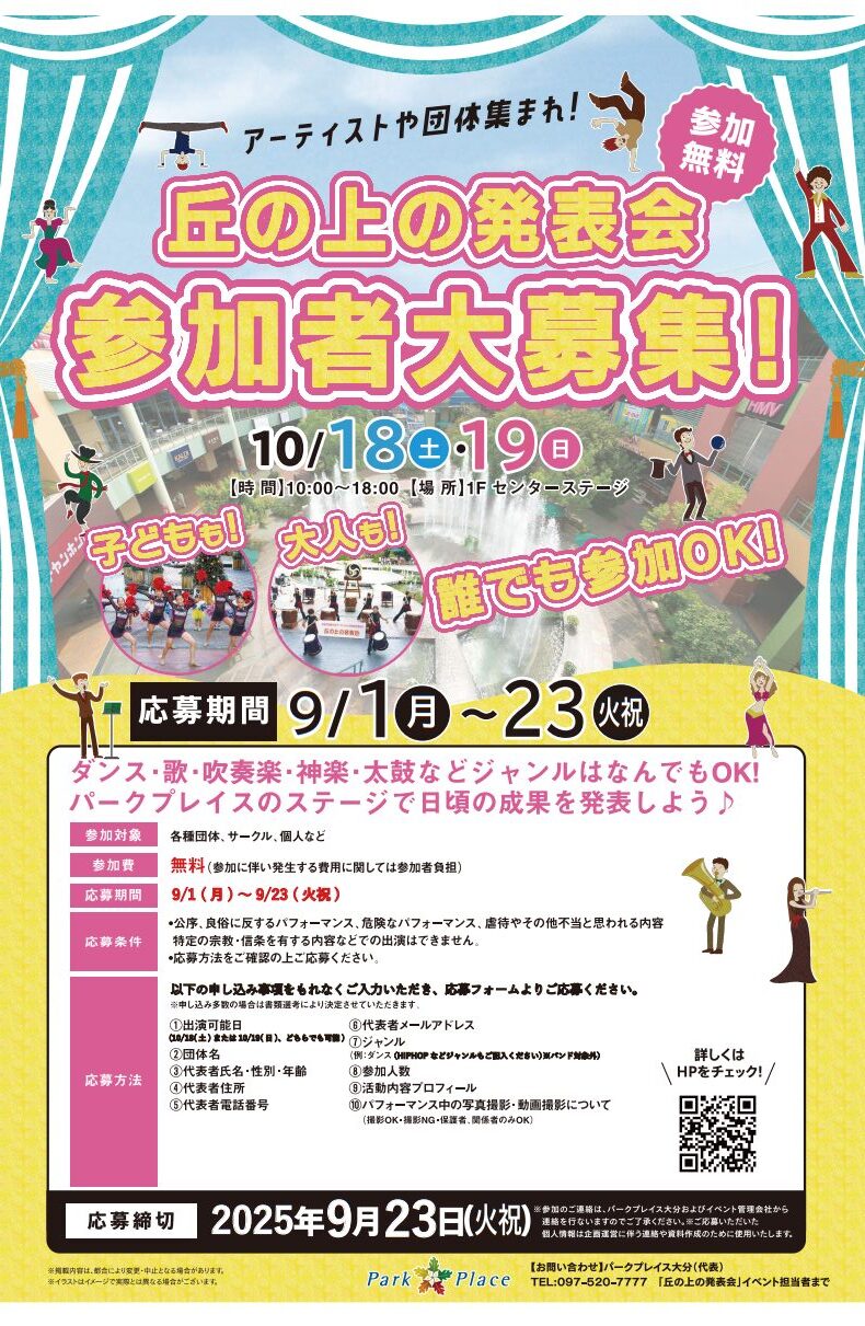 ダンス・歌・吹奏楽・神楽・太鼓などジャンルはなんでもOK!パークプレイスのステージで日頃の成果を発表しよう♪