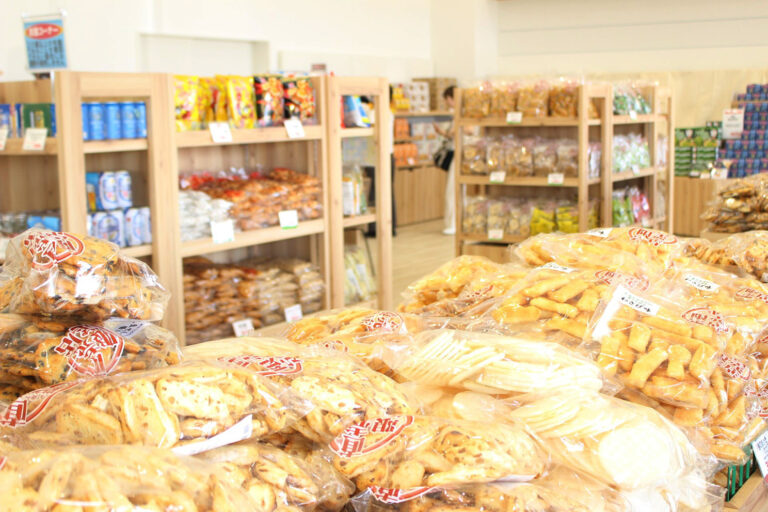 岩塚製菓グループの商品を取り揃えているほか、工場のワケあり商品や地元の農産物など、訪れるたびに変わる商品も楽しめます。
