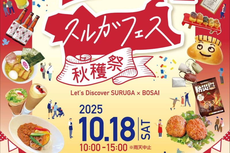 静岡市駿河区の魅力発掘イベント。地元食材を使ったピザやスイーツなどのグルメ約50店が出店します。企業や大学生によるワークショップ、防災体験ブース、ステージイベントなど、学びと遊びが満載です。会場へは無料シャトルバスの運行もあります。