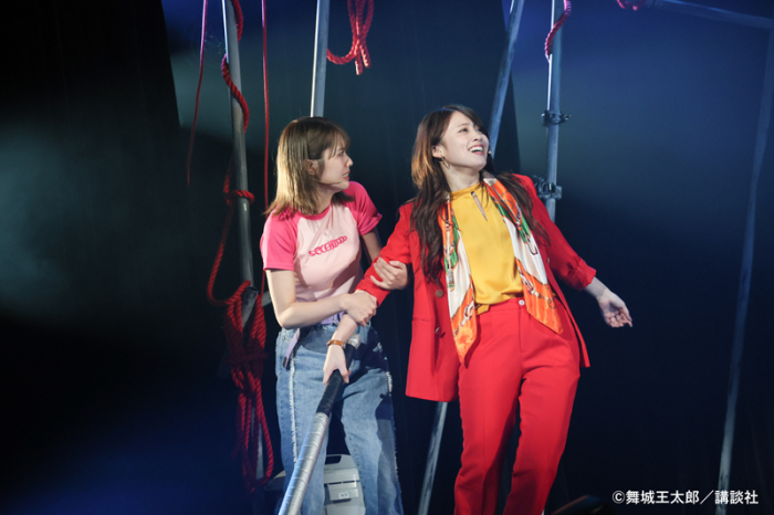 真っ赤なスーツが印象的な、井上椿役の岡部麟は強い存在感で目を惹きつけた。友紀夫に「エキセントリック」と評される椿の破天荒な人柄を見事に表現し、舞台上に現れると絵が引き締まる。その椿に「風変わりな姉妹」として並び立つ、井上榎役の小田えりなも喜怒哀楽の多彩な表情に魅力があった。榎役はダブルキャストであり、田口愛佳(AKB48)の演技にも注目したい。