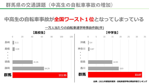 群馬県が抱えていた課題は自家用車依存による交通渋滞に加え、中高生が巻き込まれる自転車事故の多さ。2024年9月の上毛新聞は民間団体「自転車の安全利用促進委員会」が2014年に調査を始めて以降、群馬県の県別自転車事故件数で高校生が10年連続でワースト、中学生もワーストの記録が8回あると報じている。