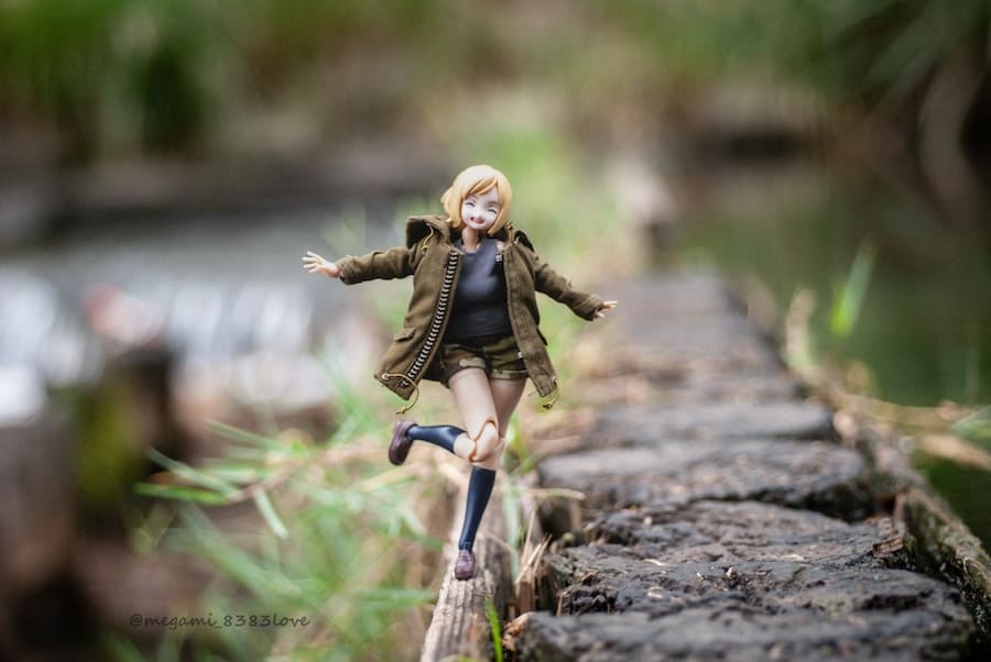 細い木の道の上に片足立ちする美少女プラモデルの写真。今にも動き出しそうなほど、生き生きとした1枚です。
