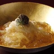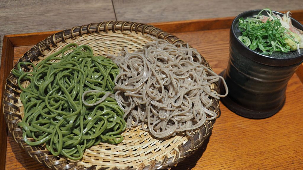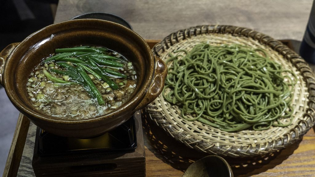 看板メニューの十割そばは、そば殻ごと丁寧に挽いており、香ばしい風味としっかりとしたコシ、そして十割とは思えないつるりとした喉ごしが特徴だ。熱々のままいただく「熱鴨ねぎつけ蕎麦」や、抹茶のコントラストが鮮やかな「十割二色ざる蕎麦」をはじめ、「京きつね九条ねぎそば」など、見た目にも美しい一品が揃う。