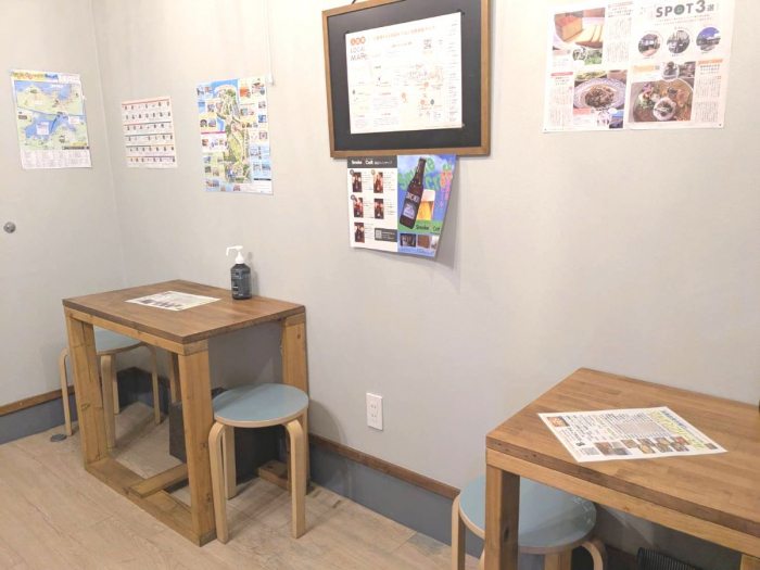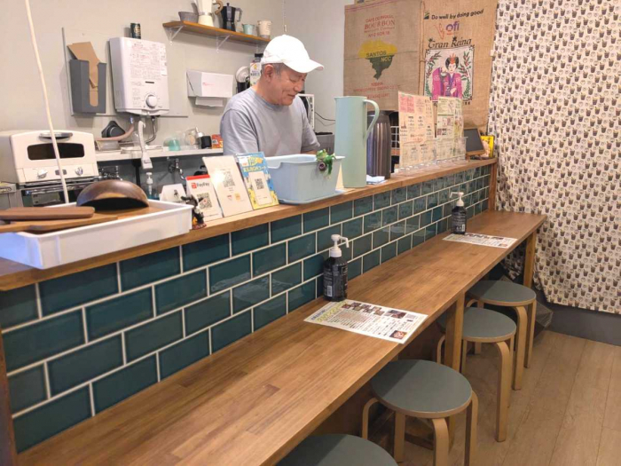 奥さんとDIYして作り上げた店内は、ナチュラルな色合いのテーブルやカウンター前の爽やかなグリーンタイルがかわいい、居心地の良い空間となっています。