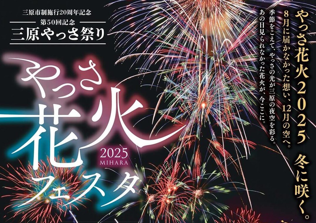 2025年12月7日(日)、三原市で三原市制施行20周年記念「2025やっさ花火フェスタ~見せたかった花火がここにある。50回記念 冬の天空花火絵巻~」が開催されます。