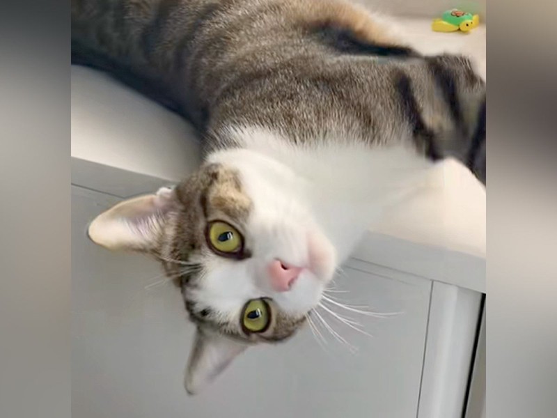 すると猫ちゃんは台の上で体を動かして、下に転がり落ちそうな格好に。飼い主さんは「危ない落ちる」と咄嗟に猫ちゃんの頭を支えたのだとか。