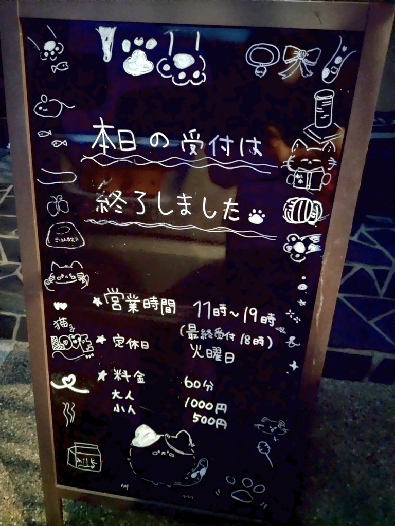 ちなみに筆者はオープンを知った時に、早速ウキウキとした気分で遊びに行ったのですが、18時が最終受付だったため、その日は猫ちゃんに会えませんでした。 (とはいえ、看板も可愛かったので思わず写真を撮りました♪)