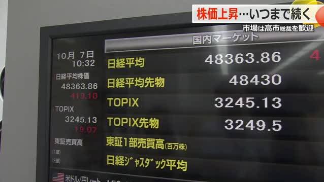 高市新総裁は選挙戦の中で「大胆な金融緩和」と「積極的な財政出動」を柱とする経済政策を打ち出している。市場では、政府・日銀による協調路線の強化や、成長分野への大型投資の拡大などへの期待が広がっており、「高市相場」への思惑が株価を押し上げたとみられる。