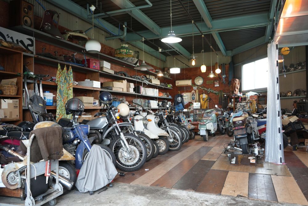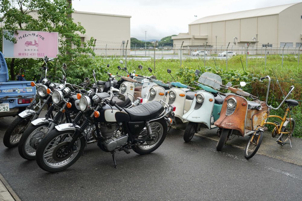 まだ免許も取得していないのに40年以上我慢していたバイクへの想いは膨らむばかり、ベスパ以外にも古い日本製の原付二種への好奇心は盛り上がり、あらゆるバイク情報を収集していた。そんな時に、バイク乗りの「珈琲いわくま」の岩隈さんが紹介してくれたのが「タイムサイクル福岡空港店」の戸町伸一郎さんだった。「タイムサイクル福岡空港店」には、まあ楽しそうな懐かしい古いバイクがたくさんあった。