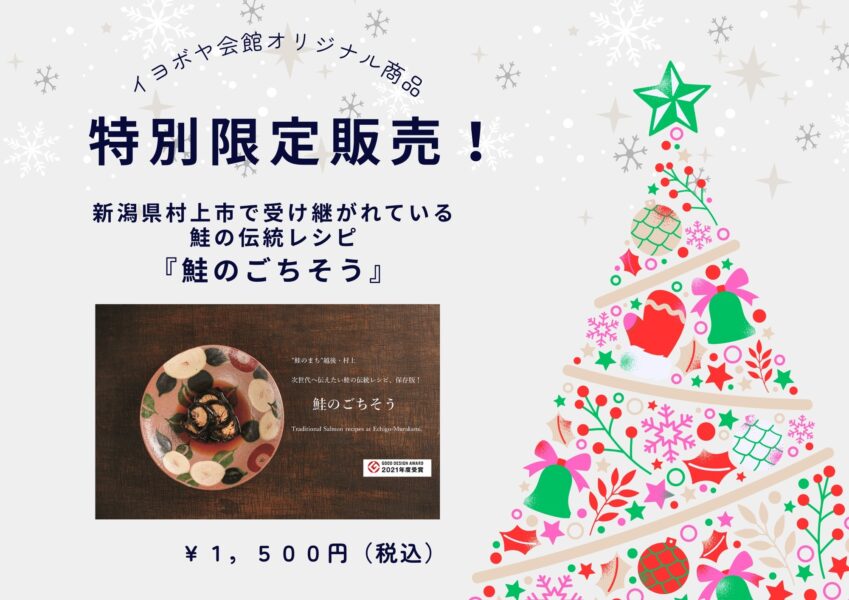 イベント会場では、イヨボヤ会館で販売されているオリジナルTシャツやマスコット、ストラップ、新潟県村上市に受け継がれる鮭の伝統レシピ『鮭のごちそう』などを特別限定販売します。