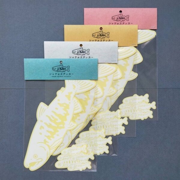 シャケの親子ステッカーパックは車や釣り道具、水筒などに貼れる耐水・耐候のステッカーとなっており、オールスターてぬぐいは北海道にいる代表的な13種のサケマスが描かれています。