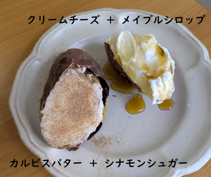 ◆御花畑マリコ☆☆☆ 成城石井「べにはるかの焼き芋」税込422円 + カルピスバター(有塩)、シナモンシュガー、クリームチーズ、メープルシロップ