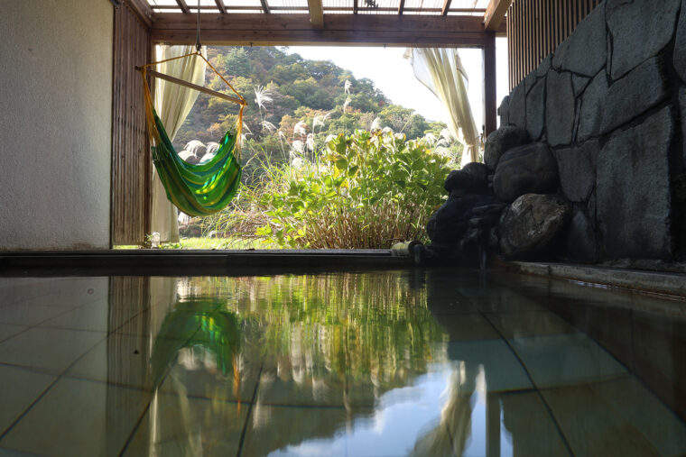 すべての客室に自家源泉 掛け流しの鷹の巣温泉を楽しめる内風呂と露天風呂が備わっており、いつでも気兼ねなく温泉を堪能できます。