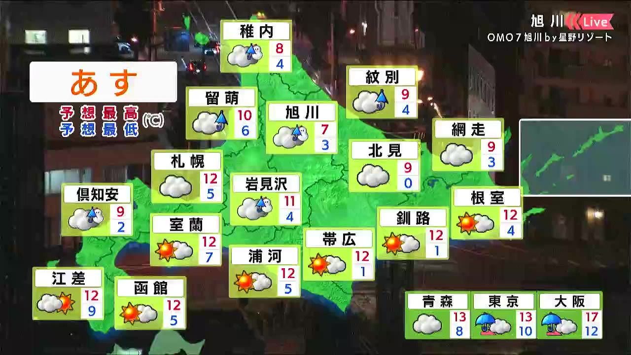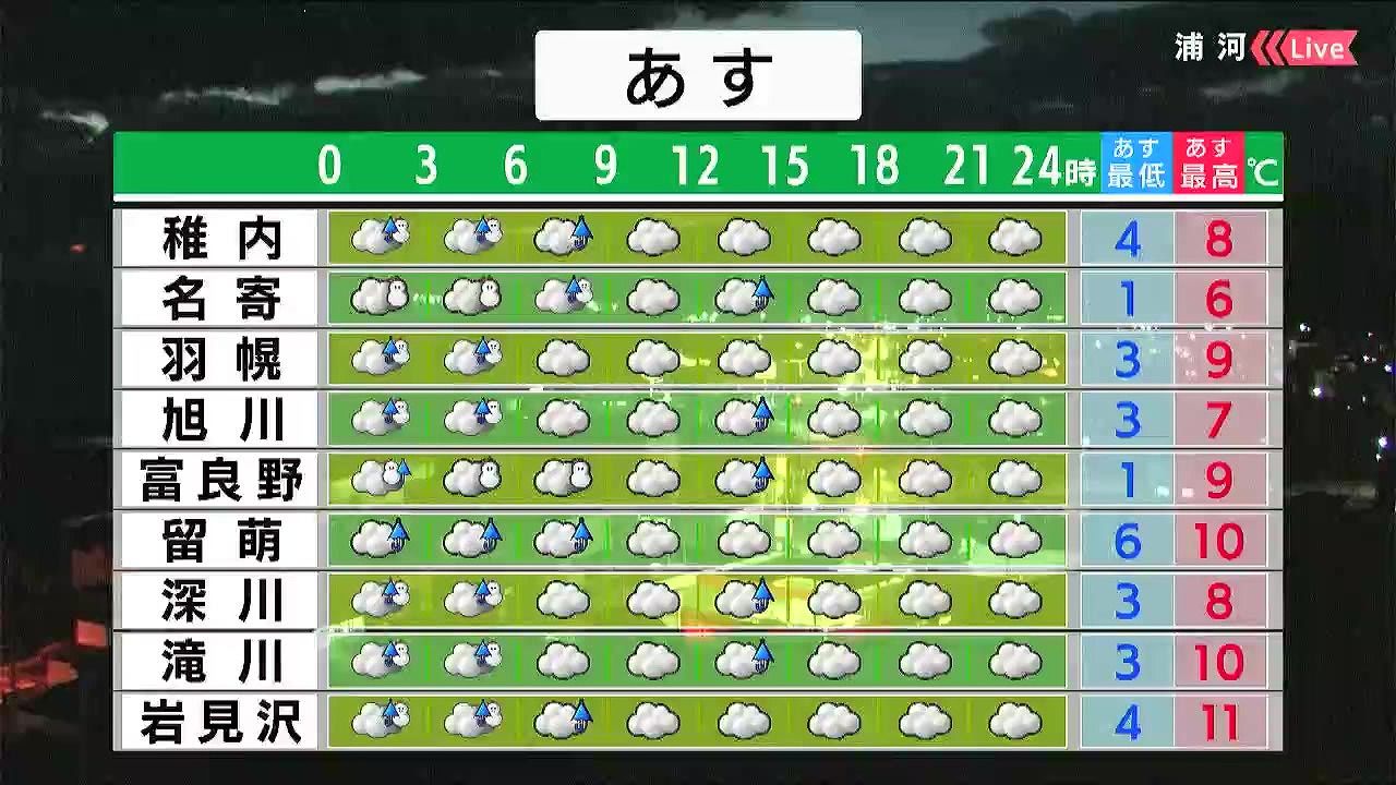 朝まで広く雨や雪が降り、路面凍結にも注意して下さい。日中も雲に覆われ、一部で小雨がぱらつきます。旭川の最高気温は11月中旬並みの7度です。