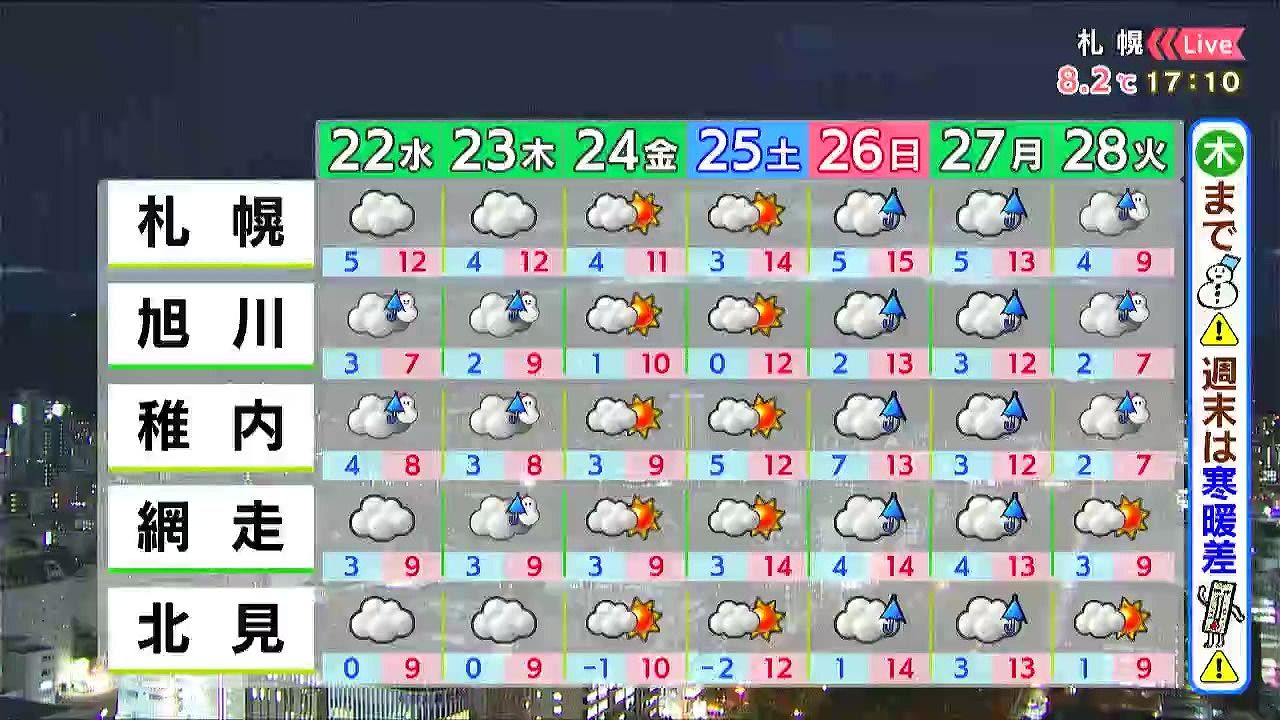 木曜は大気の状態が不安定となるため、道北やオホーツク海側を中心に雨や雪の強まるおそれがあります。金曜と土曜は日が差しますが、気温変化が大きくなります。