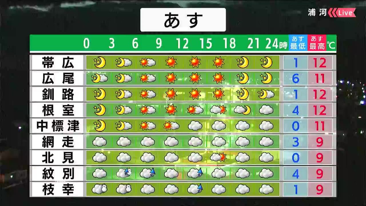 道東は晴れます。オホーツク海側は雲に覆われ、紋別や枝幸で雨や雪が降るでしょう。あす22日(水)朝も道東の内陸ではマイナス5度近くまで気温が下がりそうです。