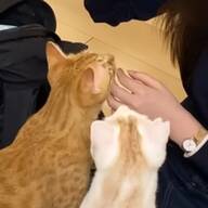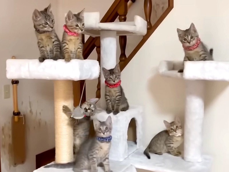 7兄妹みんなでキャットタワーに登って写真撮影をした後は、おやつの時間。おやつが運ばれてきたことに気づいた兄妹たちは、すぐにおやつの近くに集まってきたそうです。