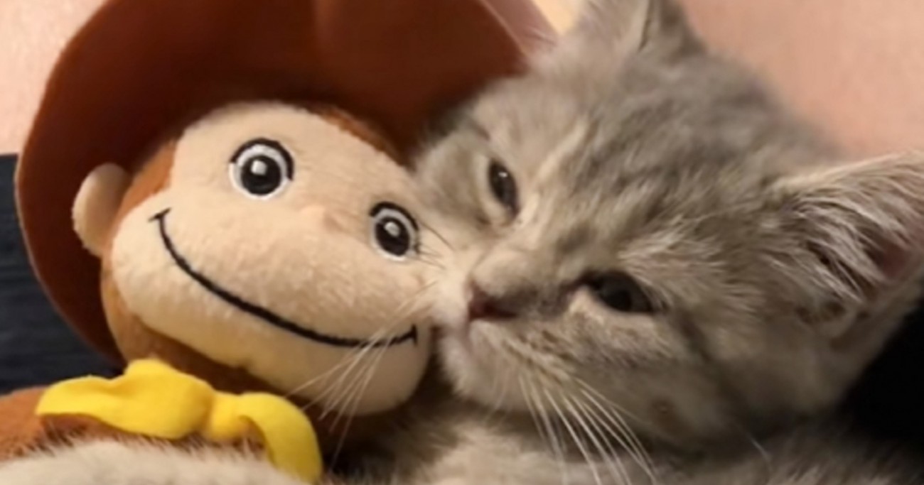 お気に入りのぬいぐるみを抱えた子猫が、必死で眠気と戦ってみたものの…?あまりにも平和な光景に、ぬいぐるみになりたくなる人が続出しています。