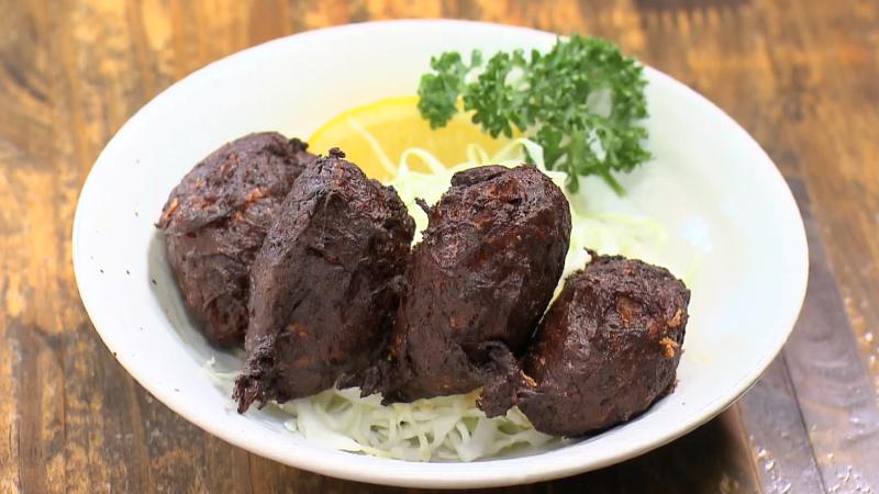 ちんちんは、熱々という意味の方言です。揚げたてが運ばれてくると、想像以上に黒い色をしています。