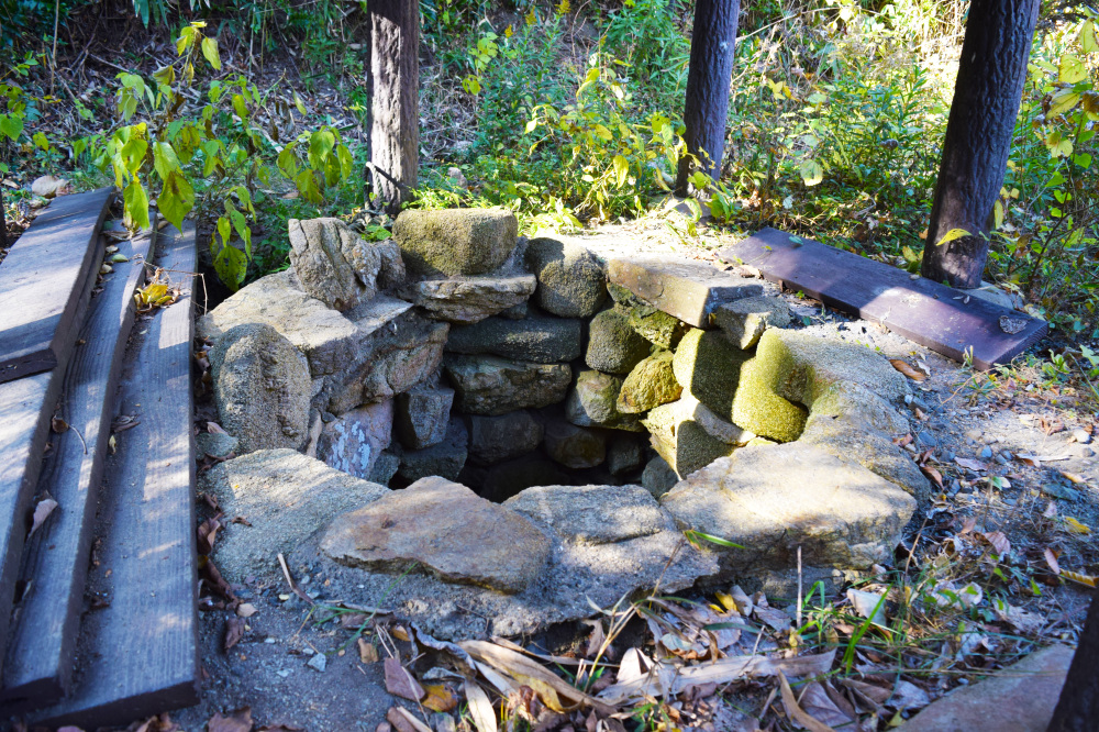 神功皇后が寄島で水を探していた際に、疲れて砂浜に鉾を突き立てたところ水が湧き出したそうです。皇后はこの水を使って神事を行ない、島を去る際には船の苫(とま:粗く編まれたむしろのようなもの)をかけて涸れないように祈られたことから「苫陰の井戸」という名が付いたと言われています。