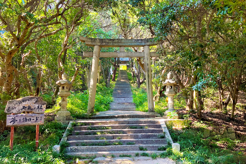古くから港として栄えた浅口市寄島町にも多くの伝承が残されています。「三ツ山(三郎島)」は神功皇后が神にお供えしたオニギリが岩になったものだと言われています。当地の人々は3つの岩を神の現身(うつしみ)と考え、「神功皇后」「応神天皇」「仲哀天皇」のほか、さまざまな神が祀られたそうです。