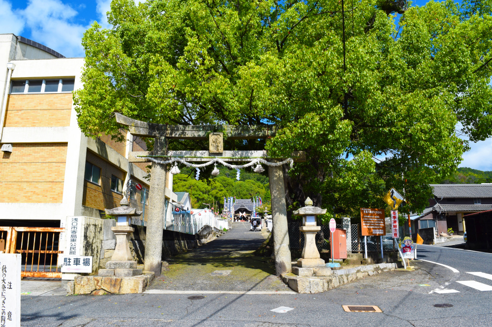 神功皇后が当地を訪れた際に「自分:あ」+「座る場所:くら」=「あくら」はどこか、とたずねたことに由来する地名だそうです。安倉の「安倉八幡神社」と、そこから少し西に位置する「大浦神社」は神功皇后の遠征にちなんだ壮大な秋季例大祭を行なうことで知られています。
