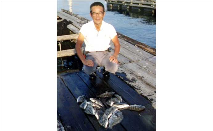 三重県鳥羽市本浦のやま栄渡船のイカダでは、13日大阪の川本さんがシラサエビとオキアミでクロダイ28~35cmを7匹キャッチ。6日鈴鹿の山中さんはサナギとオキアミで26~41cmを6匹上げている。