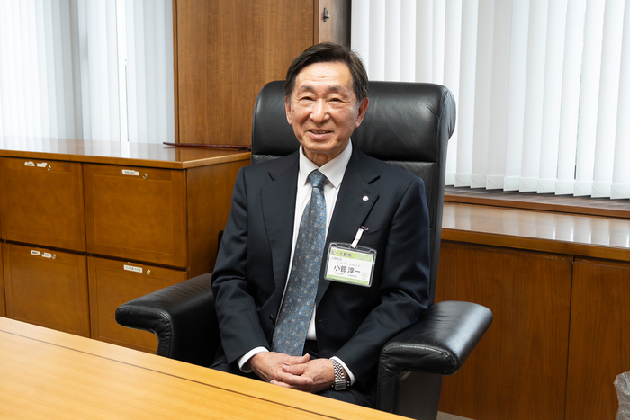 《画像:初登庁し、市長室のいすに座る小菅新市長》